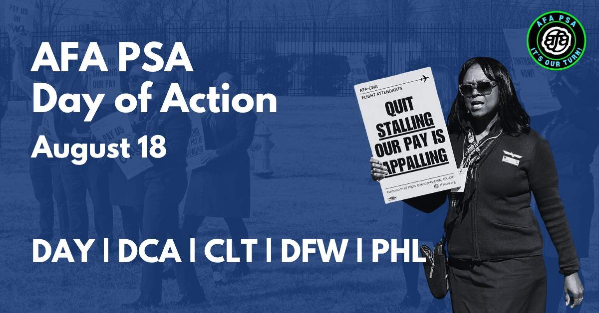 On August 18, AFA-CWA-represented Flight Attendants at PSA Airlines will host a Day of Action before mediated negotiations resume on August 20. PSA members will hold informational pickets at five airports to send a message that low wages will not be accepted and that PSA needs to bargain seriously. PSA is a subsidiary of American Airlines.