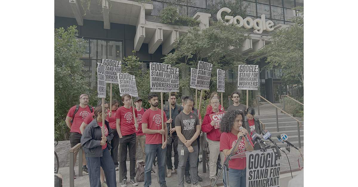 On Monday morning, leadership and members of the Alphabet Workers Union-CWA Local 9009 (AWU-CWA) condemned the Trump Administration’s “Restriction on Entry of Certain Nonimmigrant Workers” proclamation, which would impose a $100,000 fee for workers applying for an H-1B visa in the United States.