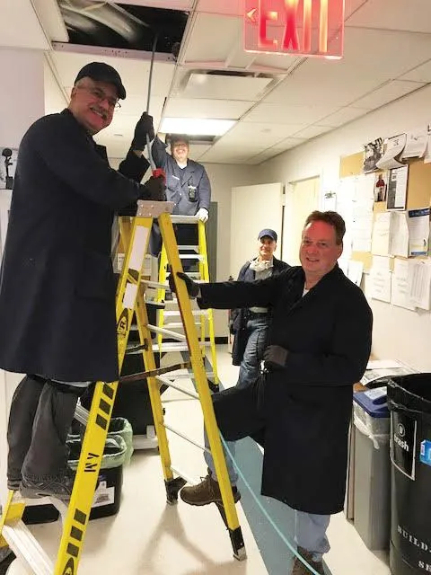 NABET-CWA Local 16 members working at ABC television in New York City. As members of the Systems Maintenance And Assembly Group ( S.M.A.G.), they are currently running fiber optic cables for the ongoing upgrades to the network's broadcast equipment. These broadcast professionals are all long-time employees who have perfected their craft along the way. Pictured on the ladder in the back is engineer Doug Graham. Next to him, on the ground, is Engineer Anthony Esposito. In the forefront, Engineer Vinnie Lubrano is up on the ladder and Engineer Rob Morris is beside him. (Photo credit: Steve Francis)