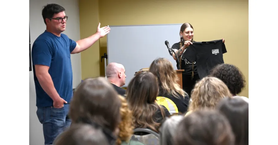 John Santa, a member of NewsGuild-CWA Local 38061, discusses the ongoing strike against the Pittsburgh Post-Gazette. Labor journalist Kim Kelly displays a T-shirt with the logo of the online strike newspaper, the Pittsburgh Union Progress, during a presentation at Mt. Lebanon Public Library on Monday. (Photo credit: Steve Mellon/Pittsburgh Union Progress, member of NewsGuild-CWA.)