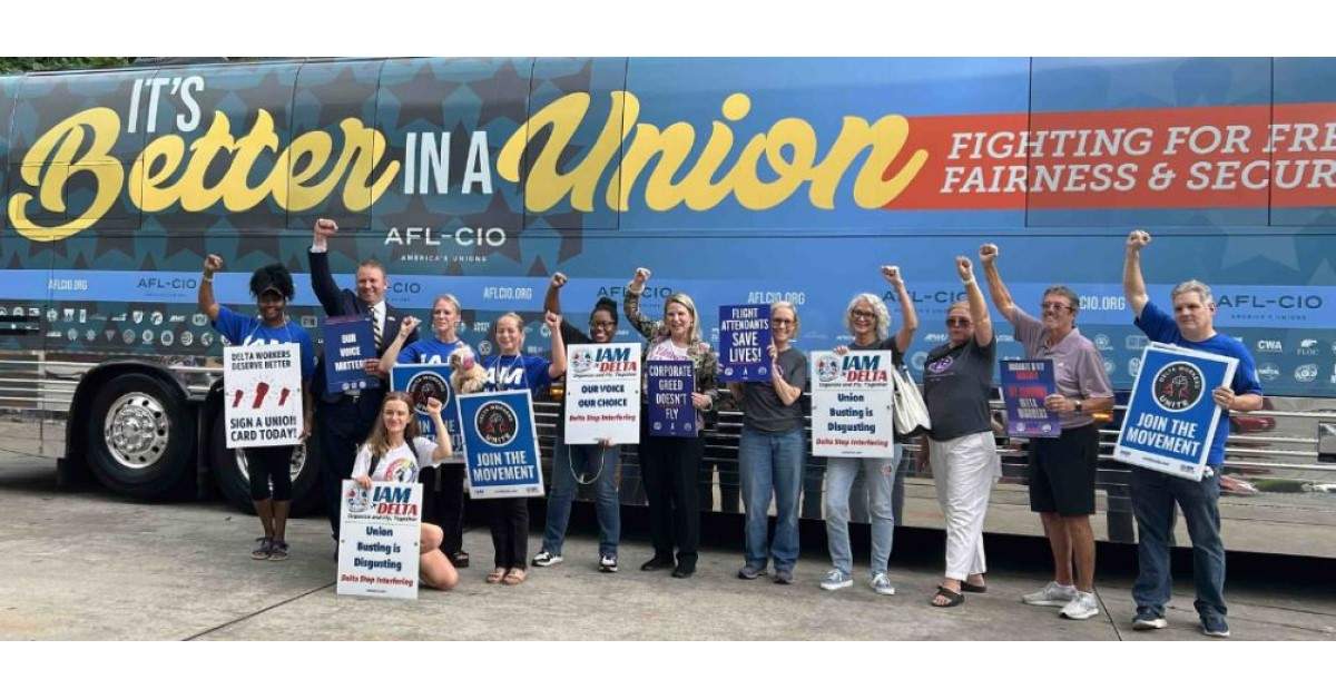 Just three days later, the AFL-CIO tour bus pulled into Atlanta, Ga., home of Delta Air Lines. Flight Attendants organizing with AFA-CWA and ramp agents fighting for a union spoke out against management's union-busting and for improved work rules at the country's most profitable airline. They also spoke with AFL-CIO President Liz Shuler about the ongoing campaign to build their union.